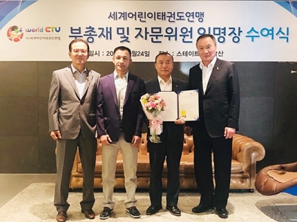 (从左至右) 卢勇贤理事、刘震山事务长、新任副总裁李相基、朴秀南总裁世界儿童跆拳道联盟新任副总裁李相基(60岁)于24日在位于中区退溪路的STATE TOWER南山26…