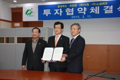 韩中地域经济协会的会员公司(株)DAAWON(代表理事 Park Jongdeuk)于2013年3月11日忠北道厅会议室会见Lee Sijong忠北道负责人签约与忠清北道的投资协议…