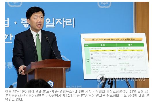이에 대해 중국 측은 한국에 비해 산업경쟁력이 처지고 대한(對韓) 무역적자가 지속적으로 확대하고 있다는 점을 들어 시장개방에 난색을 표했다.