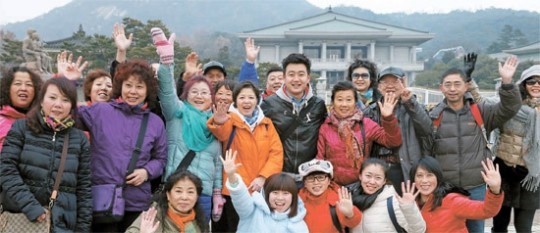 | 중국 헤이룽장에서 온 관광객들이 26일 청와대 분수대광장에서 기념사진을 찍고 있다. [김상선 기자] |