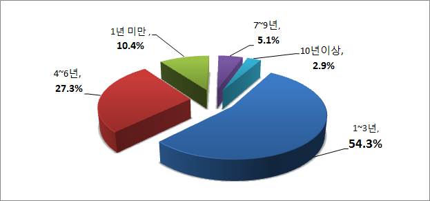 중국내 한국기업들의 인력관련 또 다른 어려움은 직원들의 빈번한 이직과 높은 임금 인상률로 나타났다. 응답기업의 40.6%(복수응답)가 가장 큰 애로로 직원들의 빈번한 이동을 언급했으며, 그 다음으로 임금인상 과다(33.5%), 적임자를 찾기 힘든 인재 수급 불균형(29.1%), 고된 일을 기피하는 성향(19.1%) 순으로 어려움을 호소하였다. 더욱이 전체 직원 중 절반 이상이 1∼3년 사이에 이직하는 것으로 나타나 안정적인 경영의 위험요소로 자리 잡고 있음을 보여주었다. 응답기업의 54.3%가 직원들의 평균 재직기간이 1∼3년이라고 응답했으며, 4∼6년이라는 비율도 27.3% 달했다. 결국 10명 중 8명이 6년 내에 회사를 옮기는 실정이다.