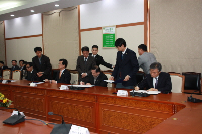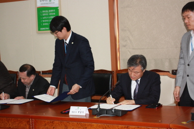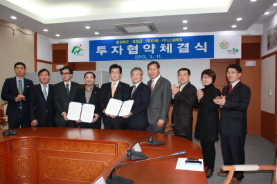 韩中地域经济协会的会员公司(株)DAAWON(代表理事 Park Jongdeuk)于2013年3月11日忠北道厅会议室会见Lee Sijong忠北道负责人签约与忠清北道的投资协议,现场有Kim Youngman沃川郡长参与。