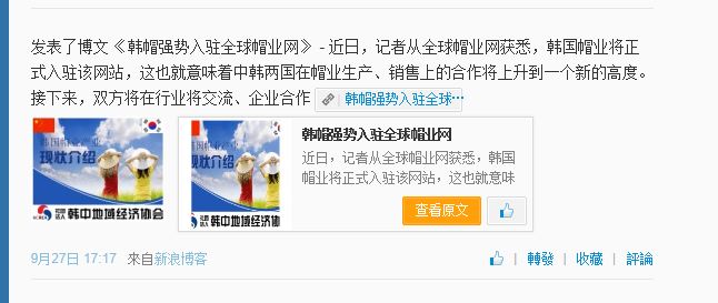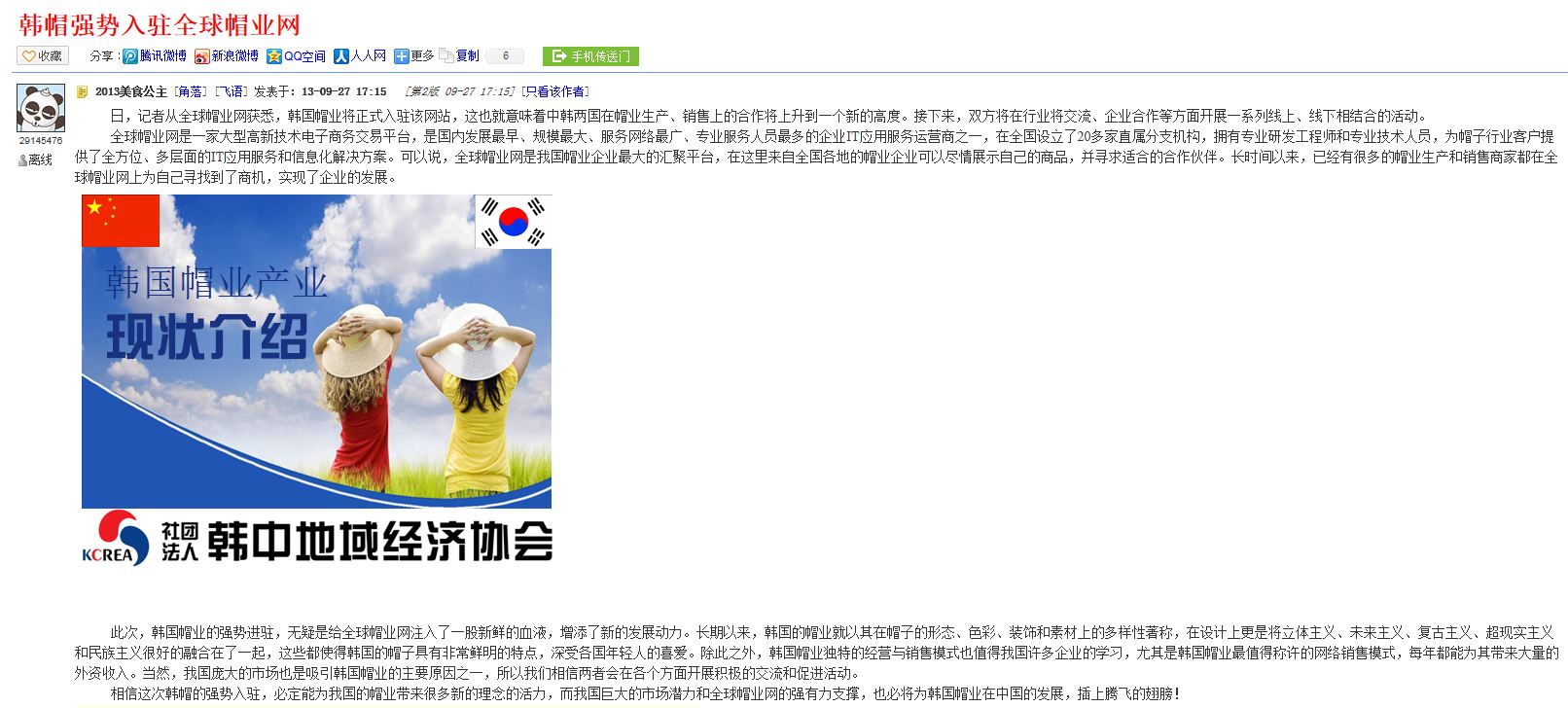 特别是此次入驻也在中国市场得到很好的反响,在中国的百度,新浪微博等网络平台上,“韩帽强势入驻全球帽业网”的话题受到很多人的关注,我协会的也达到了一天5000多的点击率。