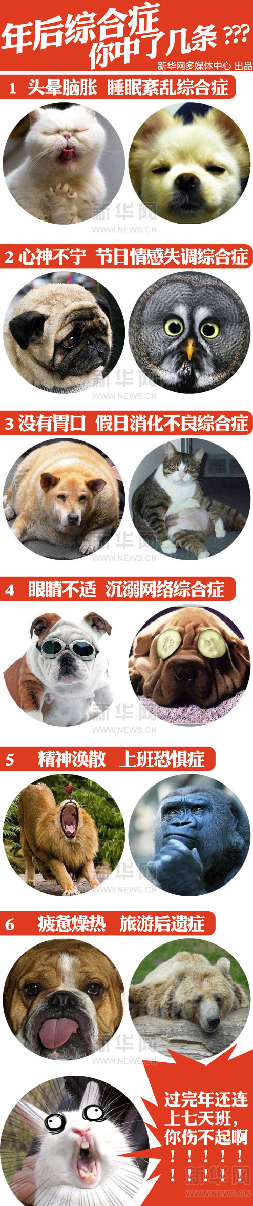 头晕脑胀,睡眠紊乱综合症;心神不宁,节日情感失调综合症;没有胃口,假日消化不良综合症;眼睛不适,沉溺网络综合症;精神涣散,上班恐惧症;疲惫燥热,旅游后遗症……因为年后连续7天的工作日,不免让刚从春节假期状态进入工作岗位的上班族们感到种种不适。对于6条最为普遍的“症状”,网友们忙着对号入座之余,纷纷感慨道,“这些症状一条都没有的,乃是"神人"”。