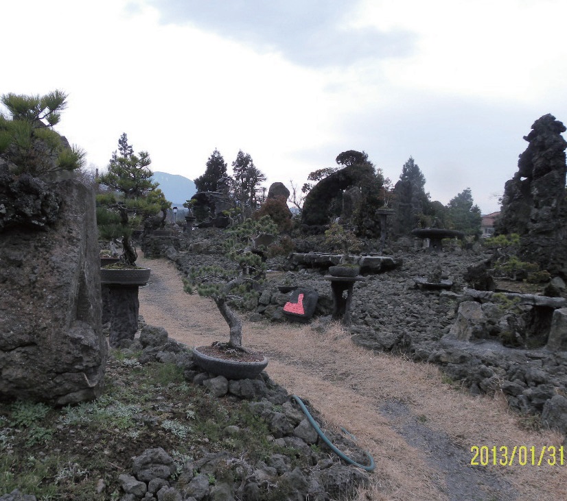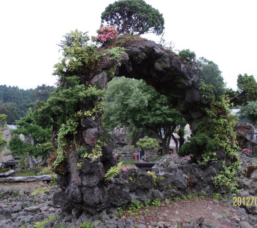 盆景是使用熔岩石(玄武岩)的蕨类植物和野草类,矮矮的树等而制造出来的叫做“盆景”。这是金政洙院长创造出的新盆景体裁,使用熔岩石(雕刻和粉)而创造出新的造型物,制造之后把济州的植物和盆景艺术搭配到盆景上,最后其升华为“盆景”
